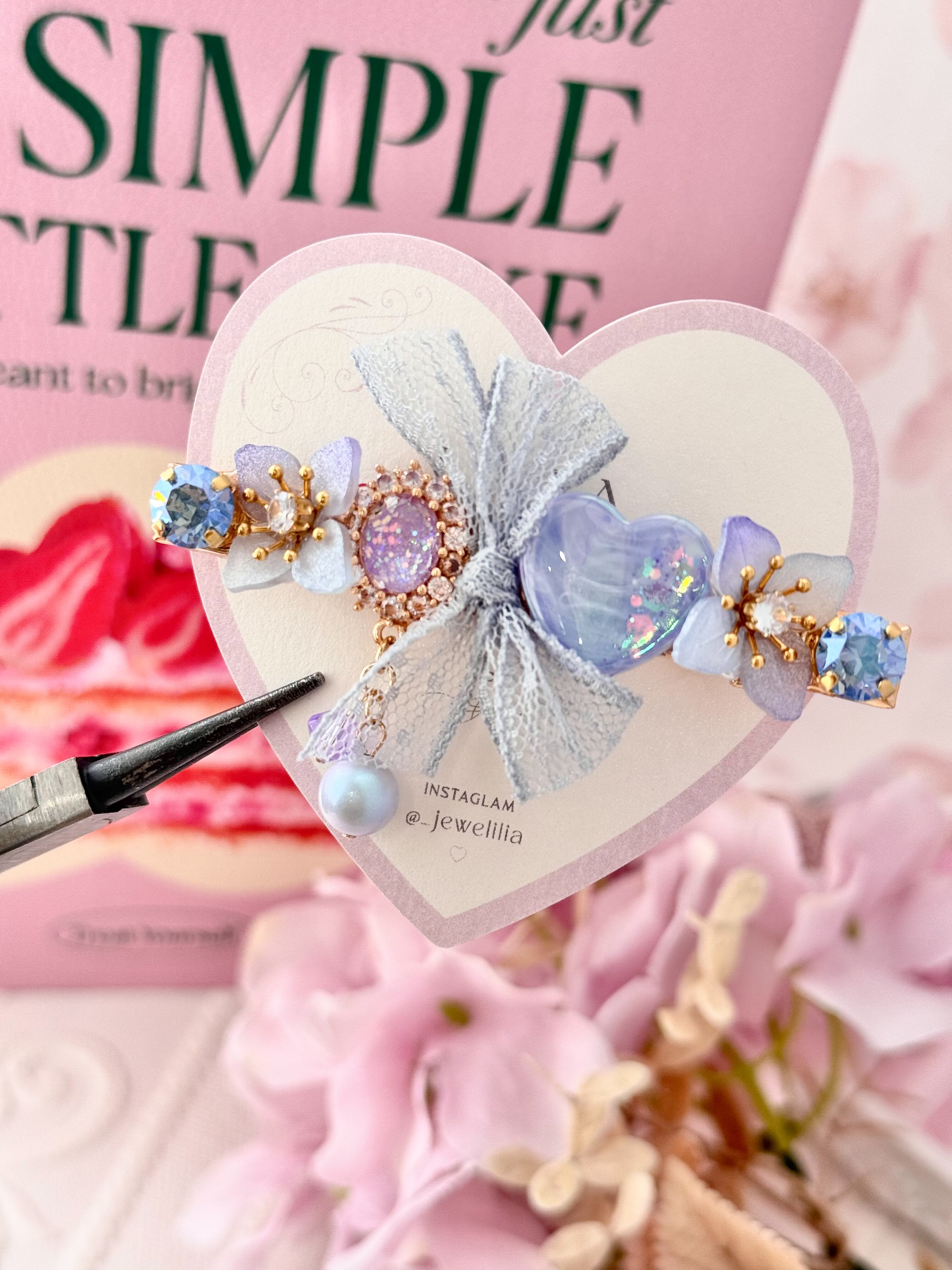 レースリボンをアクセントに使い、ブルー×ラベンダー・ホワイト×ラベンダーを意識して制作しました♡